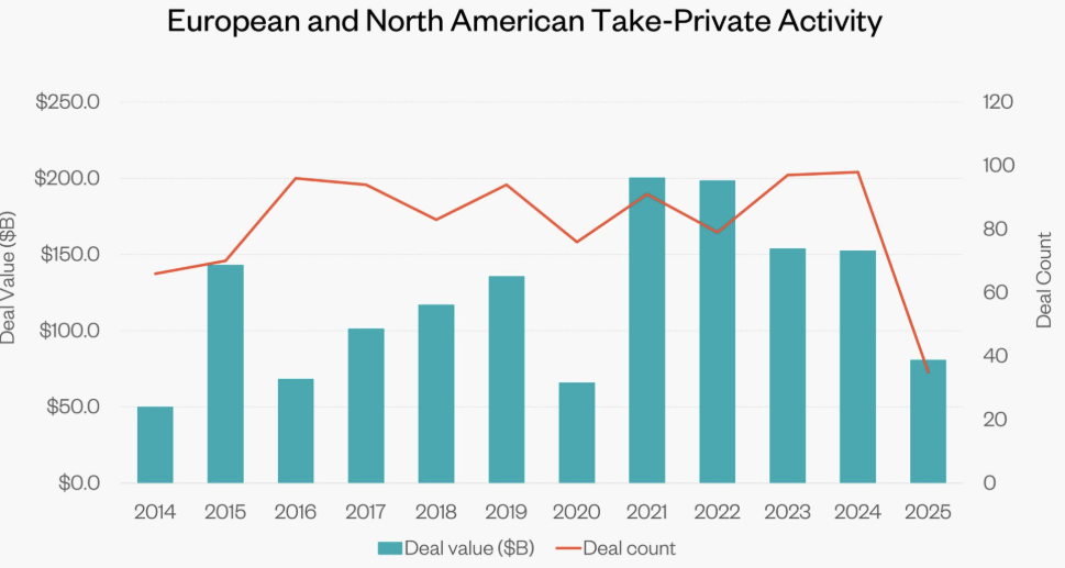 Turning to private markets, dealmaking started off slowly as tariff uncertainty made transactions difficult, but over the summer M&A has made a comeback. This week, rumors surfaced that Silver Lake is eyeing the largest LBO ever, targeting video game designer Electronic Arts in a take-private deal that could be valued near $50 billion. That scale makes yesterday’s $2.2 billion take-private of DentalCorp by GTCR look small by comparison. Over the past five years, there has been a clear trend toward private markets, which shield companies from the constant scrutiny and volatility of public markets that often prioritize short-term performance over long-term health. The EA deal could be announced as early as next week and would set 2025 up to potentially hit an all-time high for take-private activity.