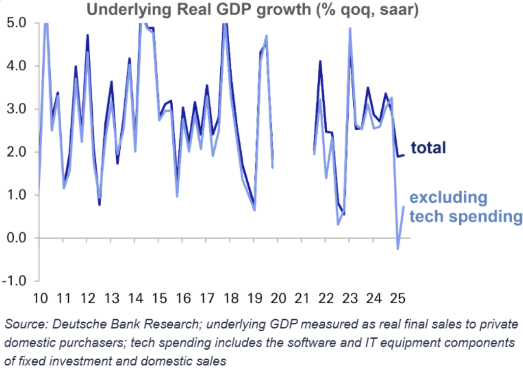 Interestingly, the data suggests that all this AI spend is actually what is propping up US economic activity. A Deutsche Bank note to clients summarized it succinctly “AI machines—in quite a literal sense—appear to be saving the U.S. economy right now… In the absence of tech-related spending, the U.S. would be close to, or in, recession this year.” Isn’t that a good thing? Well consider this next piece.
