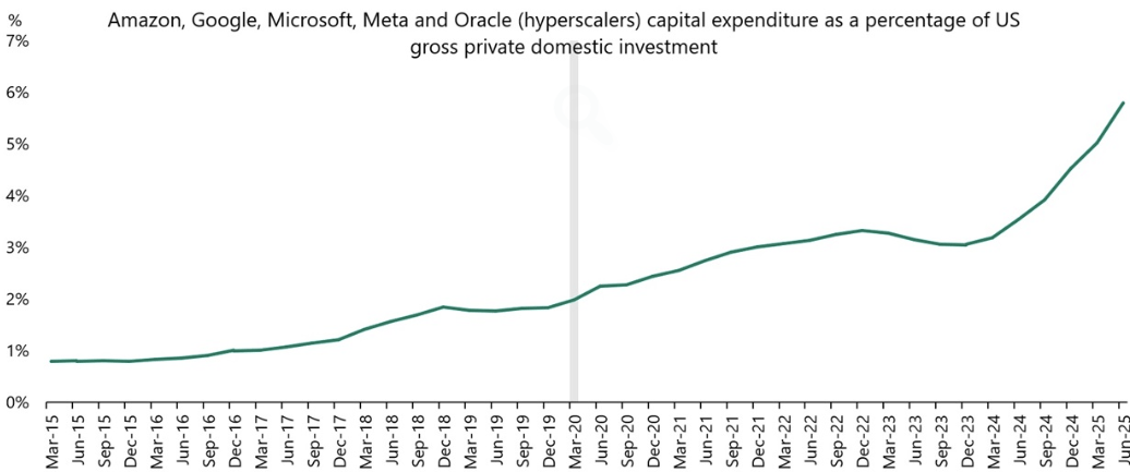 How big is the scale? Earlier this year, McKinsey estimated that AI capex could hit $7 trillion by 2030 to keep up with compute demand. That would mean data center capacity in North America jumping from 5.6 GW last year to more than 44 GW by 2030. Since 2023, hyperscaler capex as a share of gross private domestic investment has doubled, yet Bain estimates there is still a massive gap to meet projected demand.