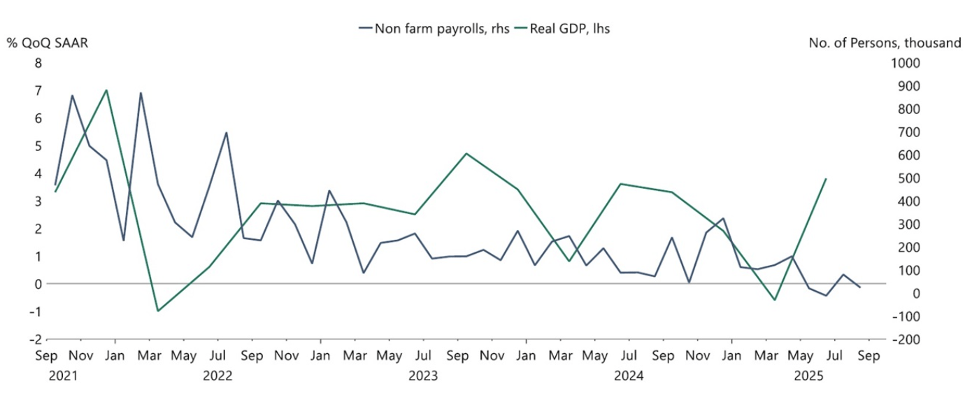 We know the Fed’s decision to cut rates was largely driven by a weakening labor market. But now, we’re facing competing forces. Non-farm payrolls are down, signaling softness, while GDP has grown 3.8% and inflation sits at 2.9%. Normally, this kind of data would not justify a rate cut.